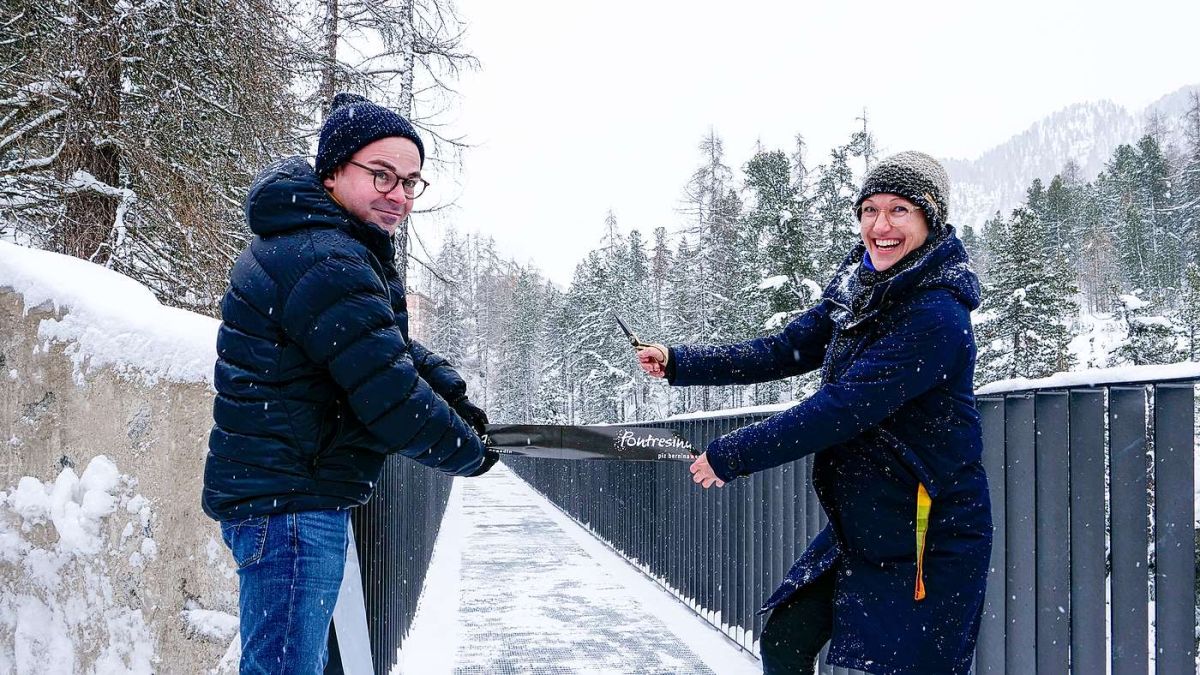 Ursin Maissen, Geschäftsführer Pontresina Tourismus, und Gemeindepräsidentin Nora Saratz Cazin eröffneten am Freitagmittag den Schwebebalken über der Wildwasserschlucht Ova da Bernina. Foto: Jon Duschletta
