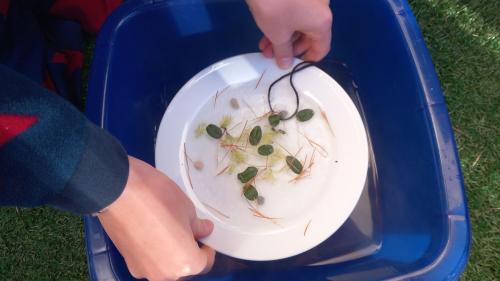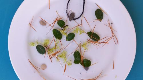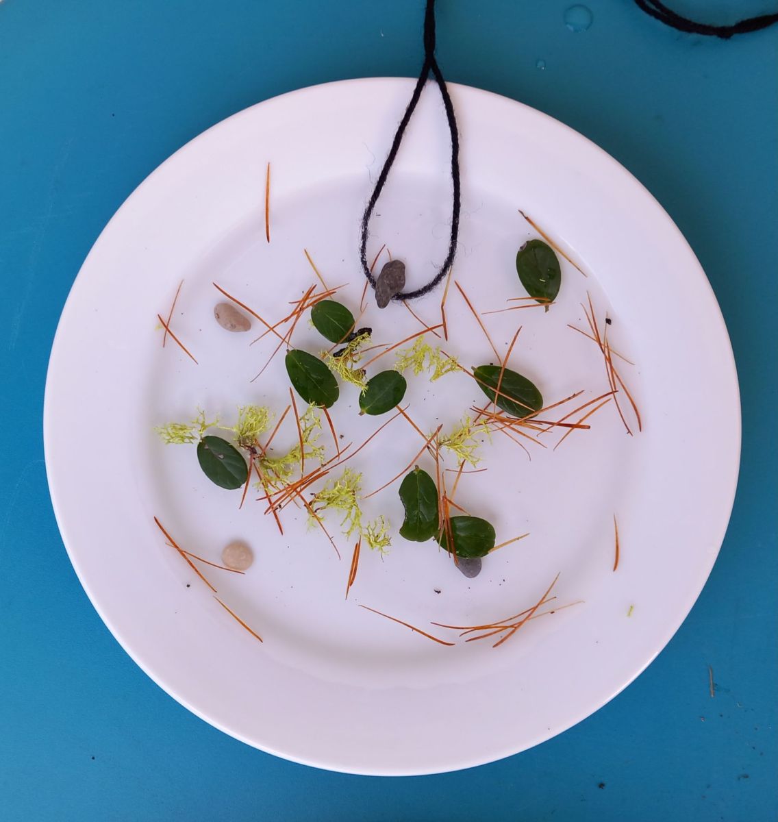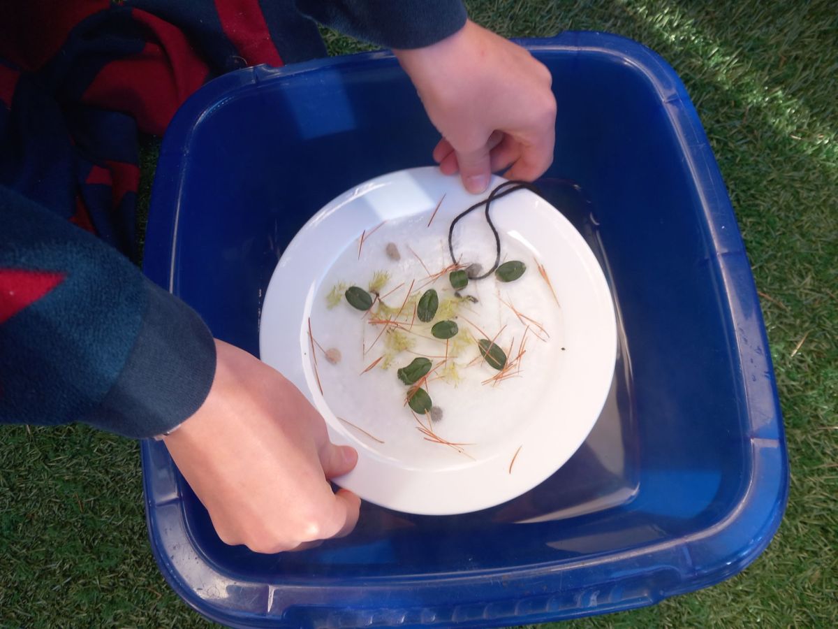 Als erstes sammelst du draussen Dinge, mit denen du dein Kunstwerk verzieren möchtests und nimmt einen Teller, den du mit Wasser füllst: