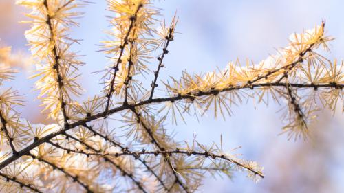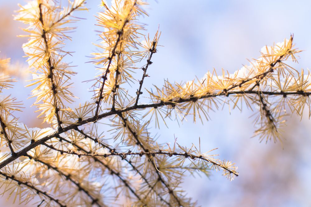 Wie die Laubbäume, so schützen sich auch die Lärchen mit dem «Nadelfall» vor der Kälte. Denn im Winter könnten die Nadeln gefrieren und der ganze Baum austrocknen. Klingt komisch, oder? Aber eigentlich ist es ganz einfach: Über die Nadeln verdunstet Wasser, die Wurzeln können aber aus dem gefrorenen Boden nicht genügend Wasser nachnehmen. Jetzt fragst du dich vielleicht, warum denn aber zum Beispiel Tannenbäume ihre Nadeln nicht abwerfen. Diese Bäume haben einen Trick, um sich vor dem Erfrieren zu schützen: Ihre Nadeln haben eine kleine Oberfläche und dicke Wände. Diejenigen der Lärche aber sind ganz weich und wären im Winter nur schlecht geschützt. Und darum hält die Lärche die Kälte nur mit abgeworfenen Nadeln aus. Bevor die Nadeln aber zu Boden segeln, baut die Lärche Chlorophyll, also das Grün, ab und lagert es für das nächste Jahr in den Wurzeln, Ästen und im Stamm ein.