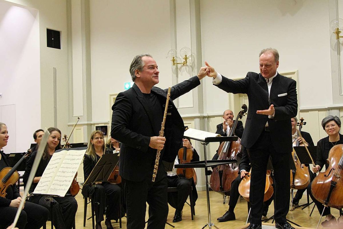 Die Sinfonia Engiadina, Flötist Emmanuel Pahud und Christoph-Mathias Mueller begeistern das Publikum in Zuoz. Foto: Stefanie Wick Widmer