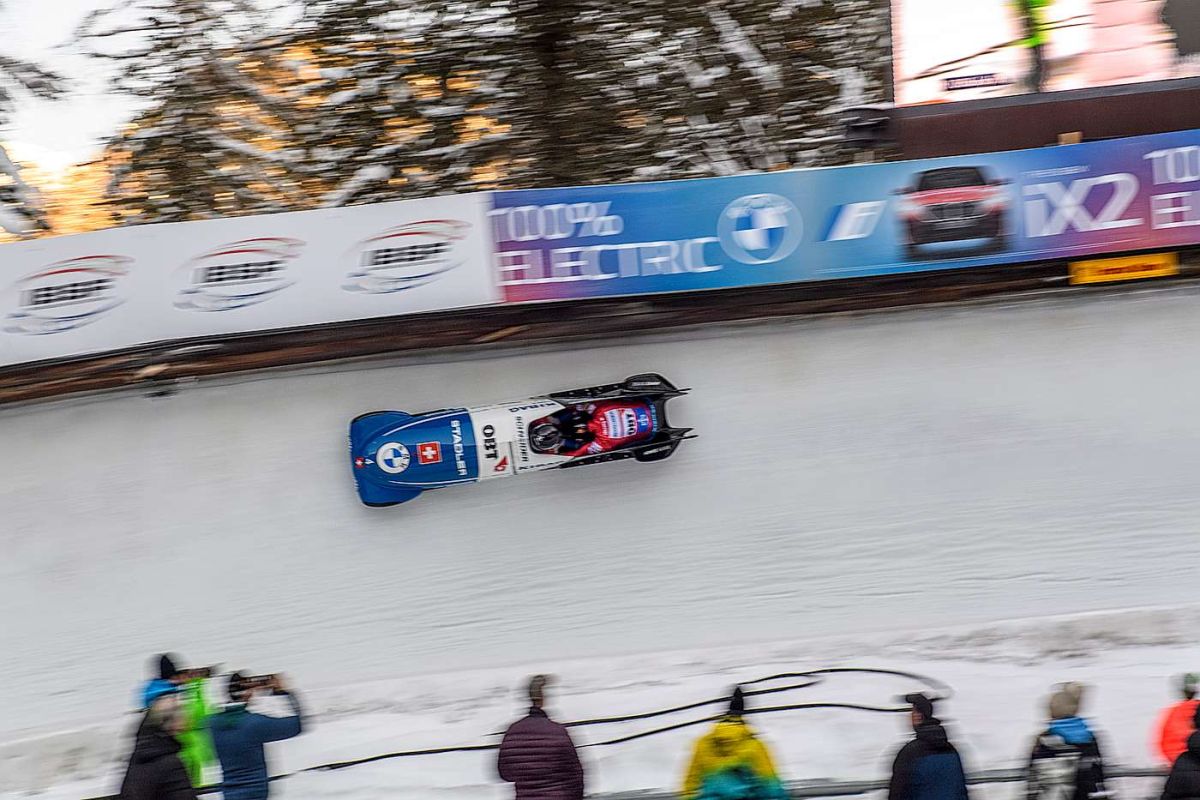 Die Drittplatzierten Schweizer Bobfahrer Vogt/Michel. Foto: fotoswiss.com/Giancarlo Cattaneo