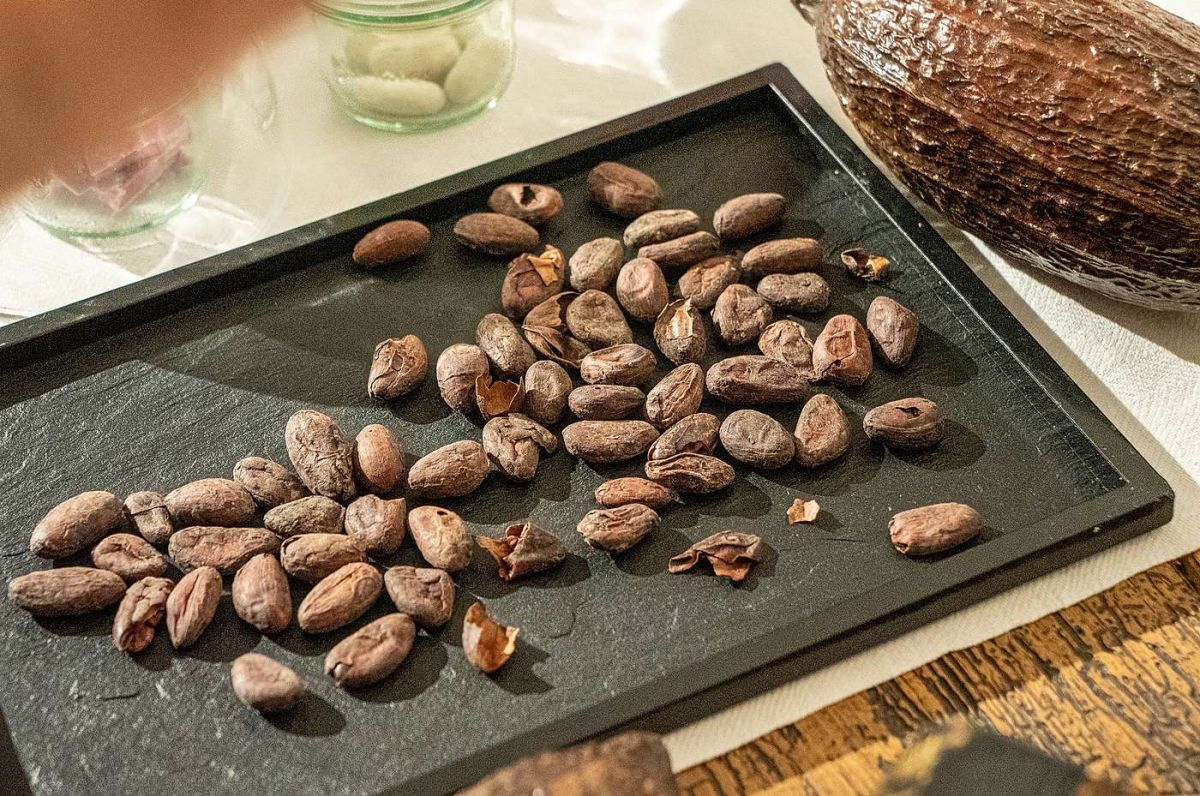 Getrocknete Kakaobohnen mit Kakaofrucht. Foto: Jon Duschletta