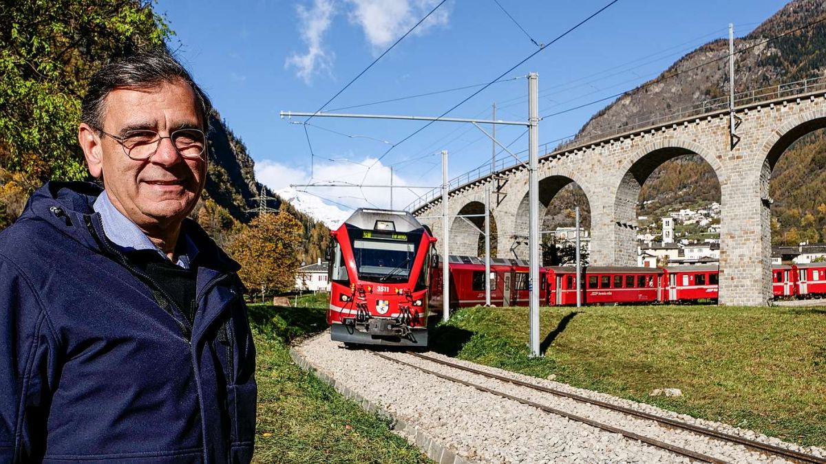 Livio Zanolari vor dem Kreisviadukt der RhB in Brusio, «einem Bauwerk allerhöchster Ästhetik». Er bedauert einzig, 2002 nicht gleich das ganze RhB-Streckennetz als Unesco-Welterbe vorgeschlagen zu haben. Foto: Jon Duschletta