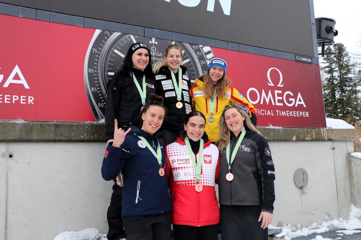 Der erste Renntag und schon die erste Goldmedaille für die Schweiz: Debora Annen (Mitte oben) sicherte sich auf ihrer Heimbahn in St.Moritz den Sieg. Foto: z. Vfg