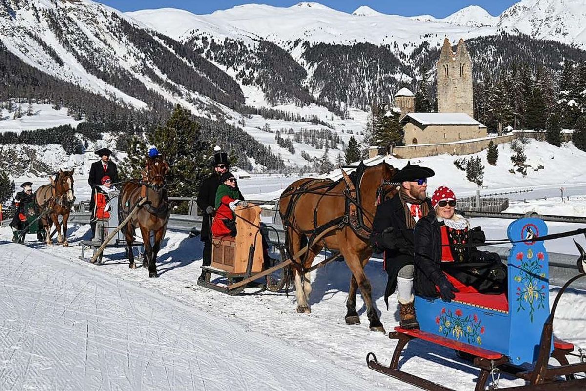 In Champfèr wurde am letzten Samstag der Winterbrauch der Schlitteda gefeiert. Paare brachen in traditionellen Engadiner Trachten zur Schlittenfahrt mit Einspännern auf. Die geschmückten Engadiner «Schlittins» glitten über die schneebedeckte Landschaft, während ein strahlend blauer Himmel die Szenerie überzog. Auch die eisigen Temperaturen von fast minus 20 Grad Celsius konnten die Begeisterung der Teilnehmerinnen und Teilnehmer nicht brechen.