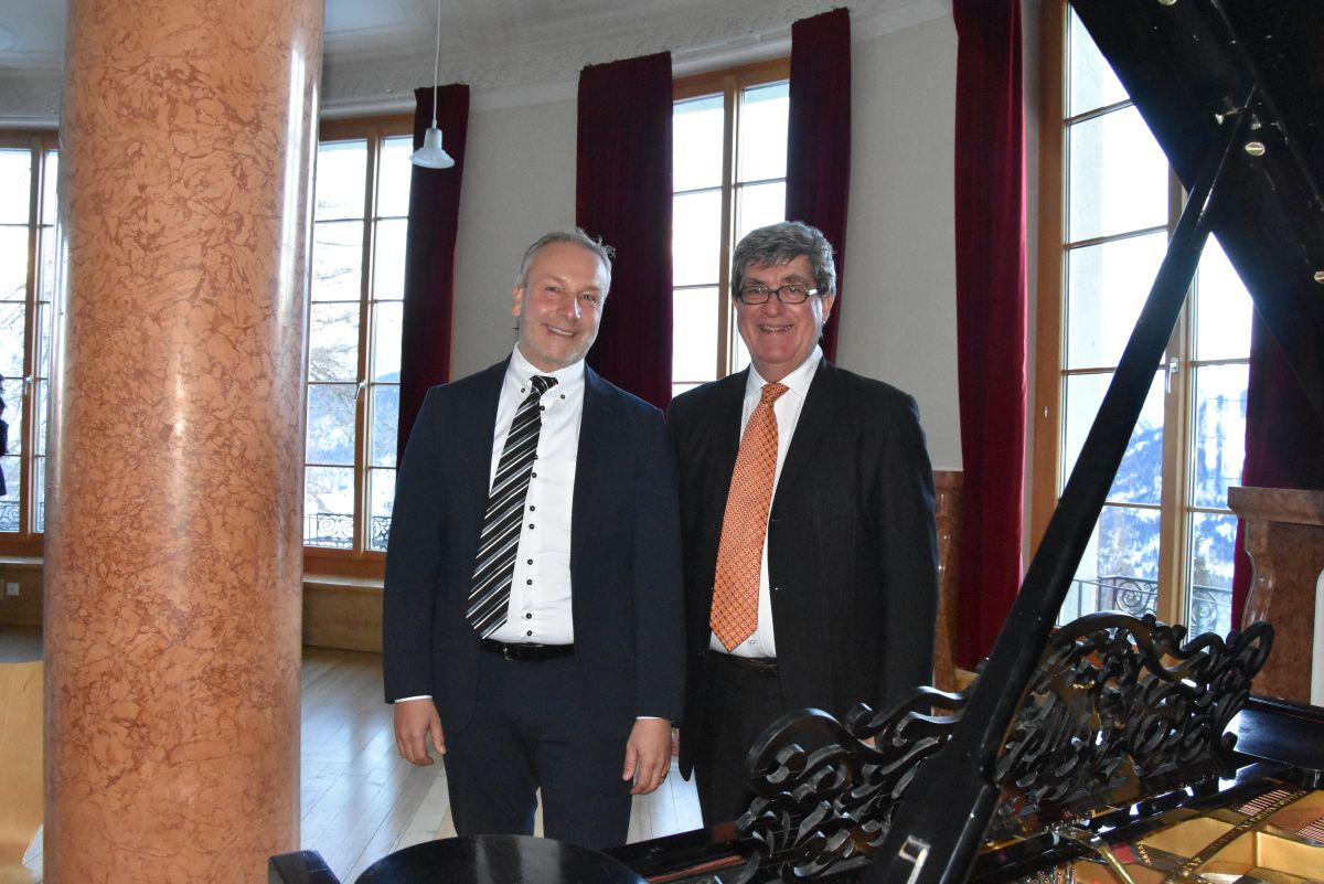 Ils respunsabels da l’Institut Otalpin Ftan, Jon Peer, president dal cussagl administrativ, e Christoph Hendrickx, manader administrativ, davo il piano da Steinway (fotografia: Nicolo Bass).
