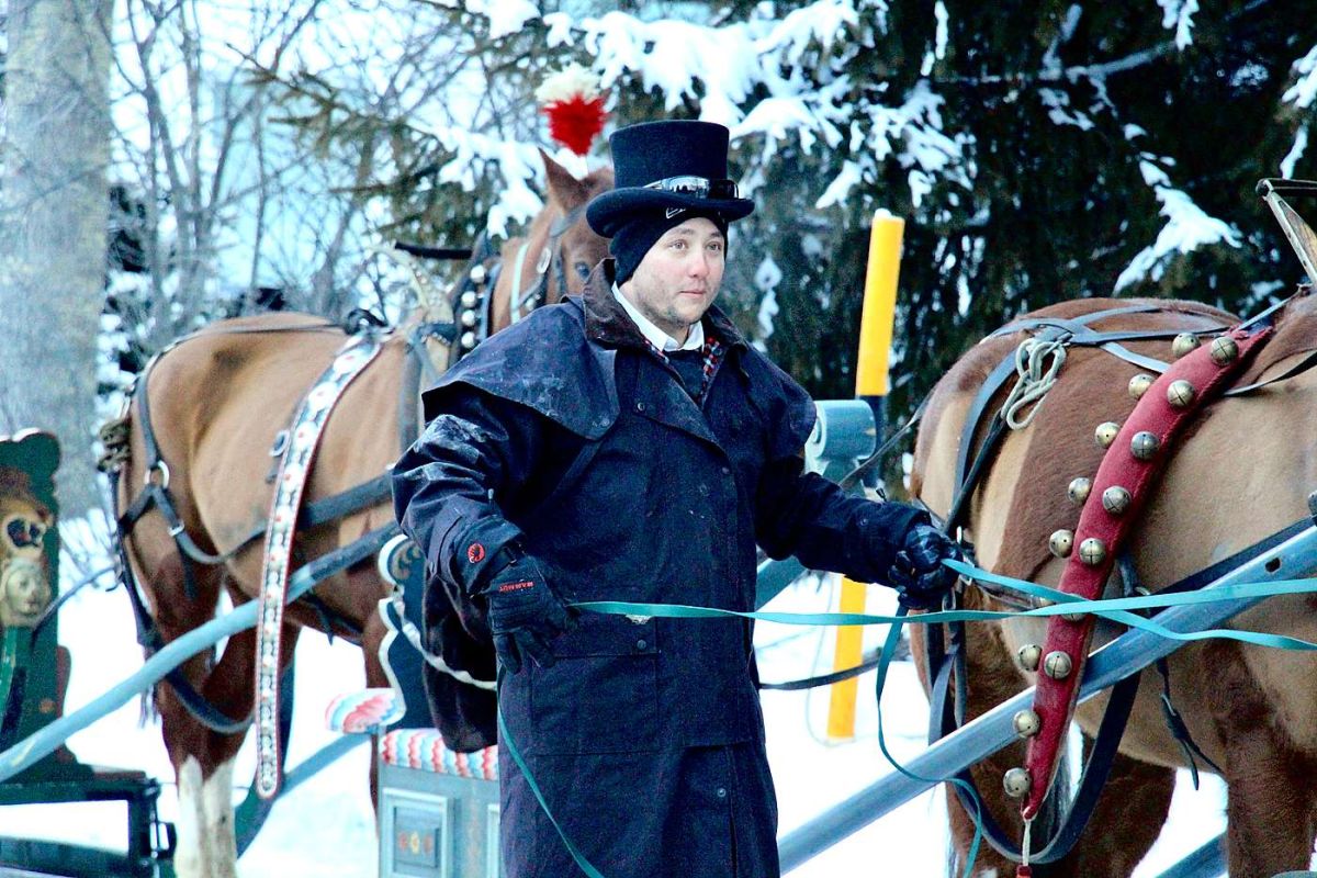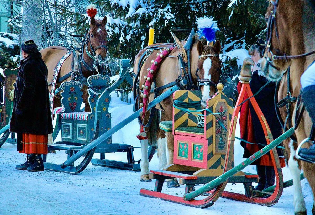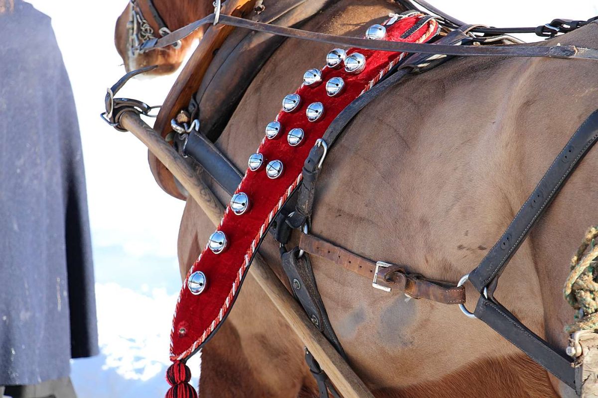Die von der Kälte dampfenden Pferde werden in St. Moritz bei der Polowiese von den Männern auf die Schlittenfahrt vorbereitet. Mit traditionellem Pferdeschmuck werden die Tiere verziert und die Schlitten startklar gemacht. Währenddessen ...