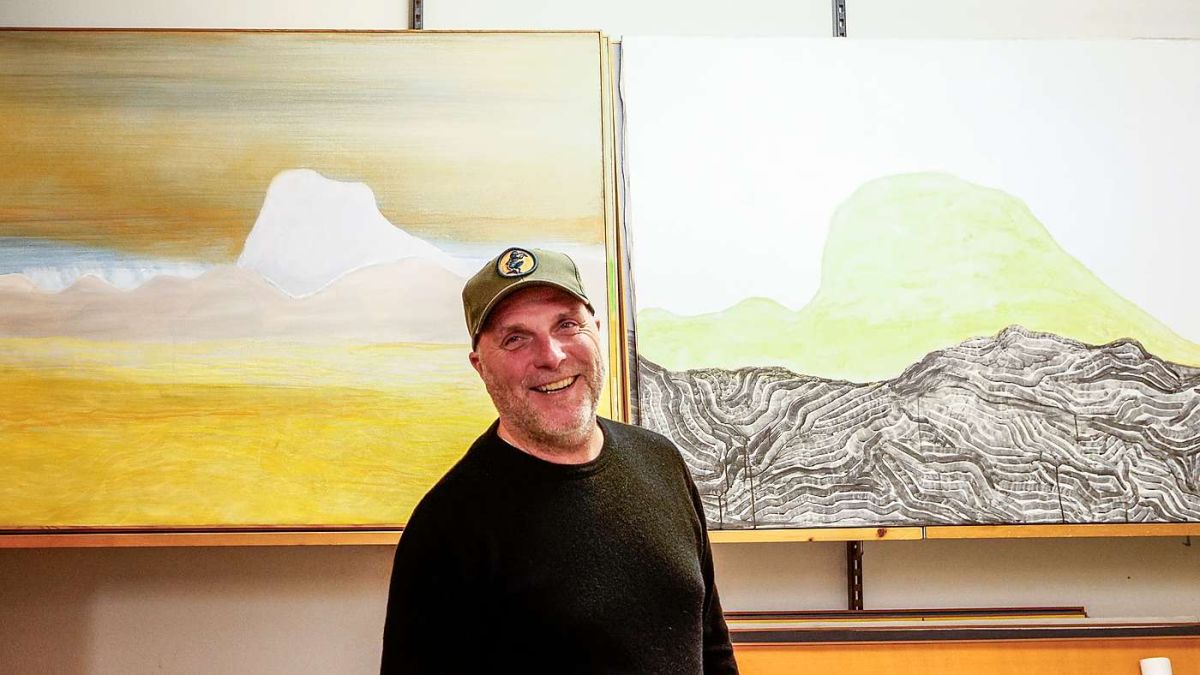 Renato Faoro, Co-Präsident des Vereins Carusell Gian Pedretti vor zwei Werken Pedrettis. Foto: Jon Duschletta