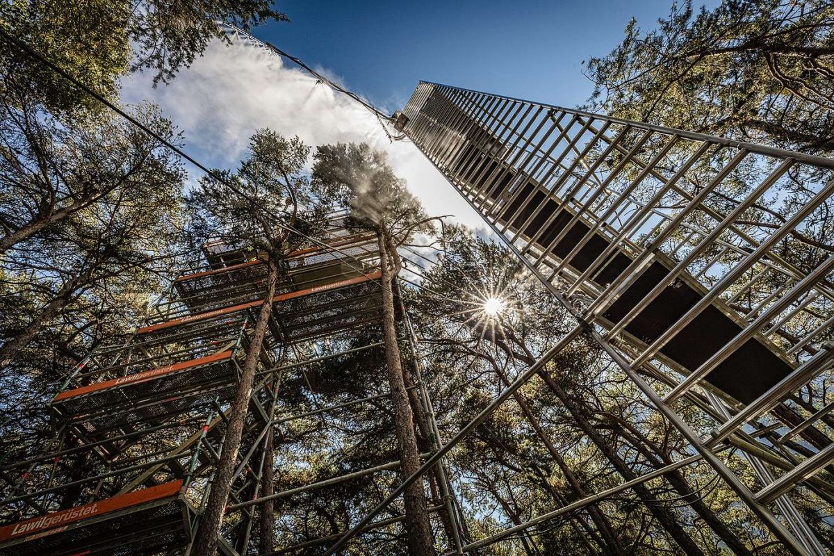 Um die Auswirkungen von atmosphärischer und Boden-Trockenheit auf die Bäume zu untersuchen, werden Föhren mit Wasserdampf besprüht. Foto: Kellenberger Photographie/Reinhard Lässig, WSL