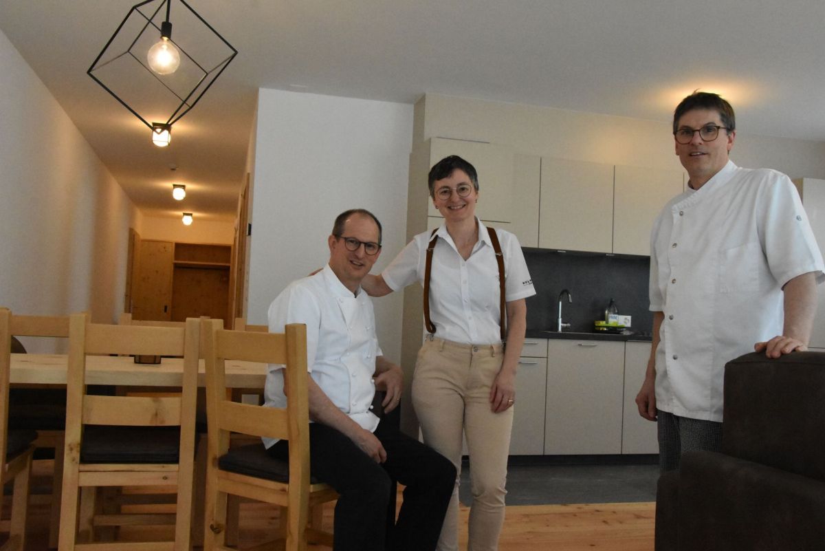 Pierre-René (da schnestra), Anita ed Olivier Grond mainan daspö 15 il Hotel Helvetia a Müstair ed han uossa investi in üna nouva sporta da sandà e wellness per giasts ed indigens (fotografia: Nicolo Bass).
