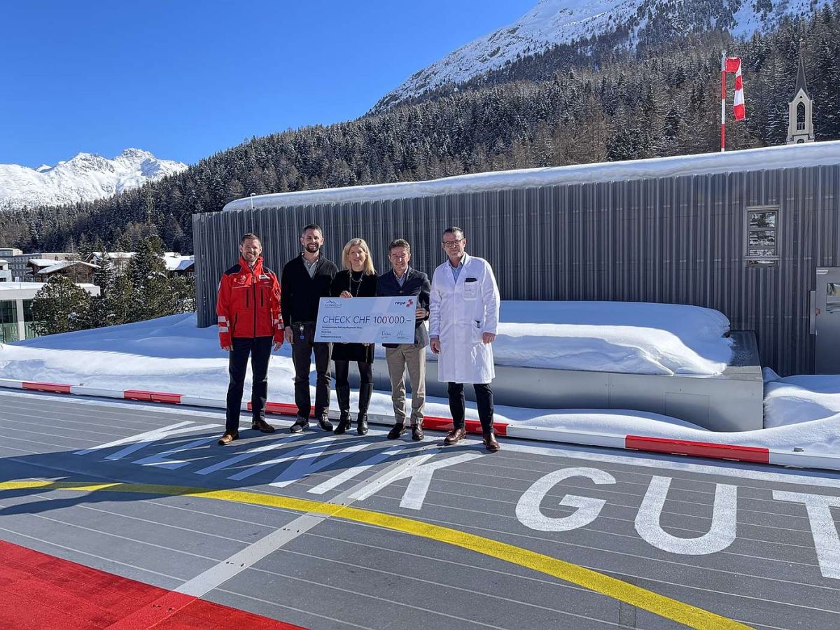 Die Rega unterstützt den Bau des Spitallandeplatzes auf der neuen Klinik Gut St. Moritz. Rega-CEO Ernst Kohler hat der Klinik Gut einen Check im Wert von 100 000 Franken übergeben.