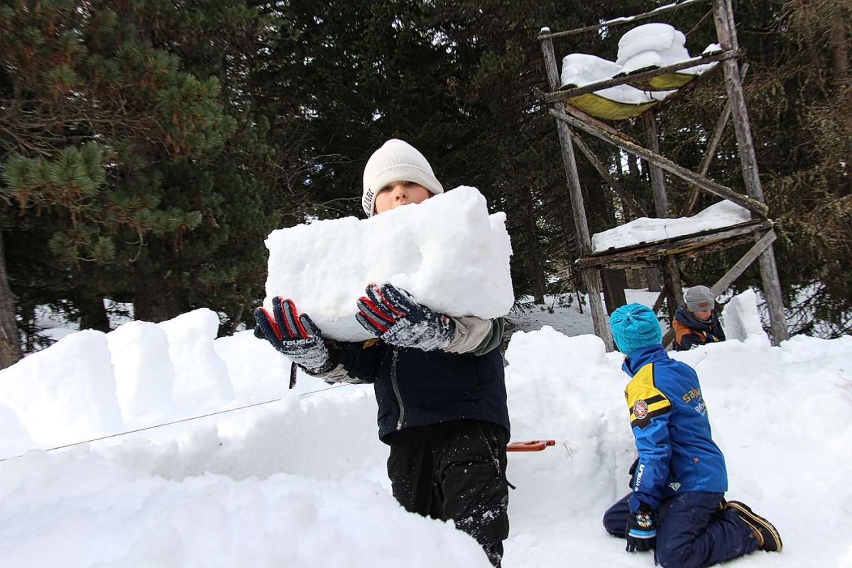 Samstag, 10.00 Uhr: Die Kinder der Battasendas Engiadin’Ota sind dabei, Blöcke aus dem fest gepressten Schnee neben dem Pfadfinderhaus in St. Moritz unweit der Tennishalle zu schneiden. «Die Blöcke müssen mindestens 15 Zentimeter dick ...