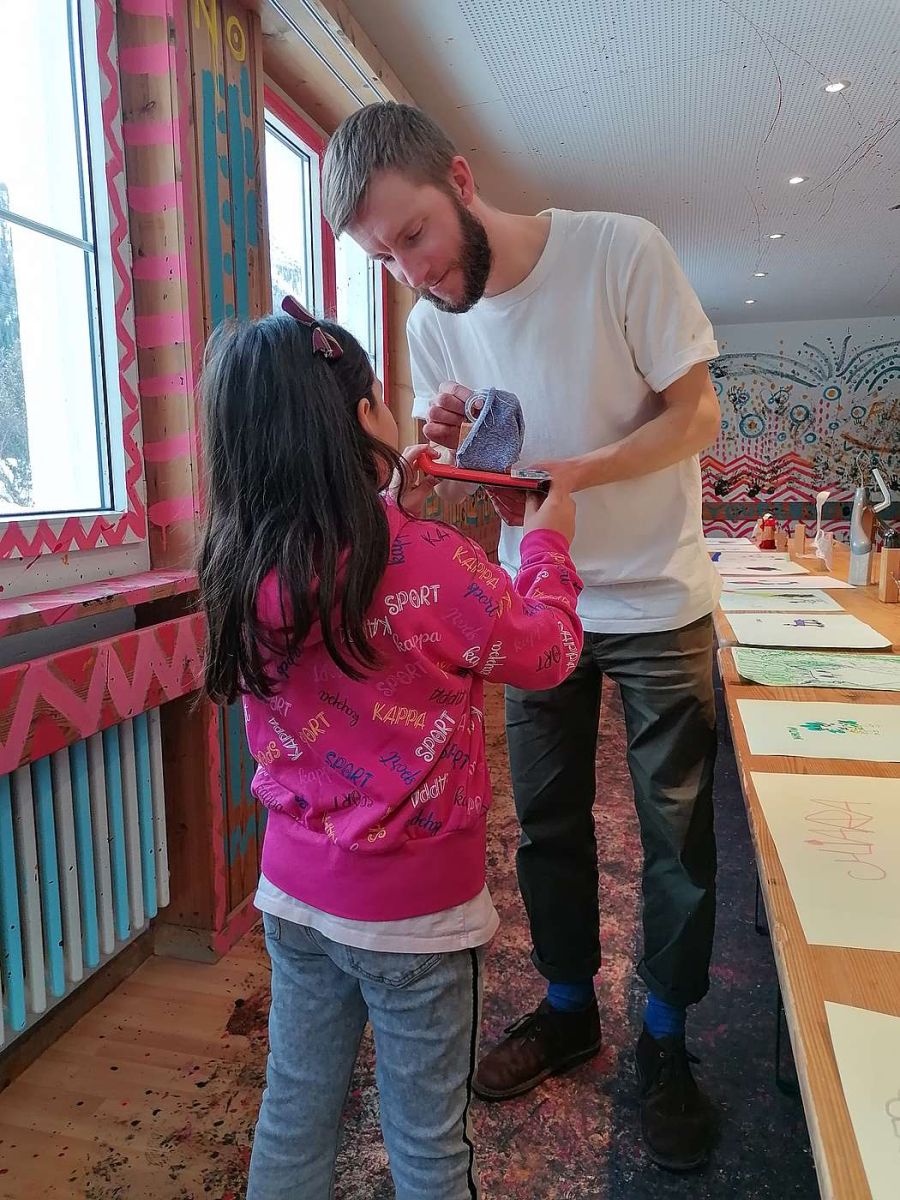 Die siebenjährige Chiara hat ein Boot gebastelt und präsentiert Produktdesigner Georg Foster stolz das Ergebnis. Foto: Denise Muchenberger