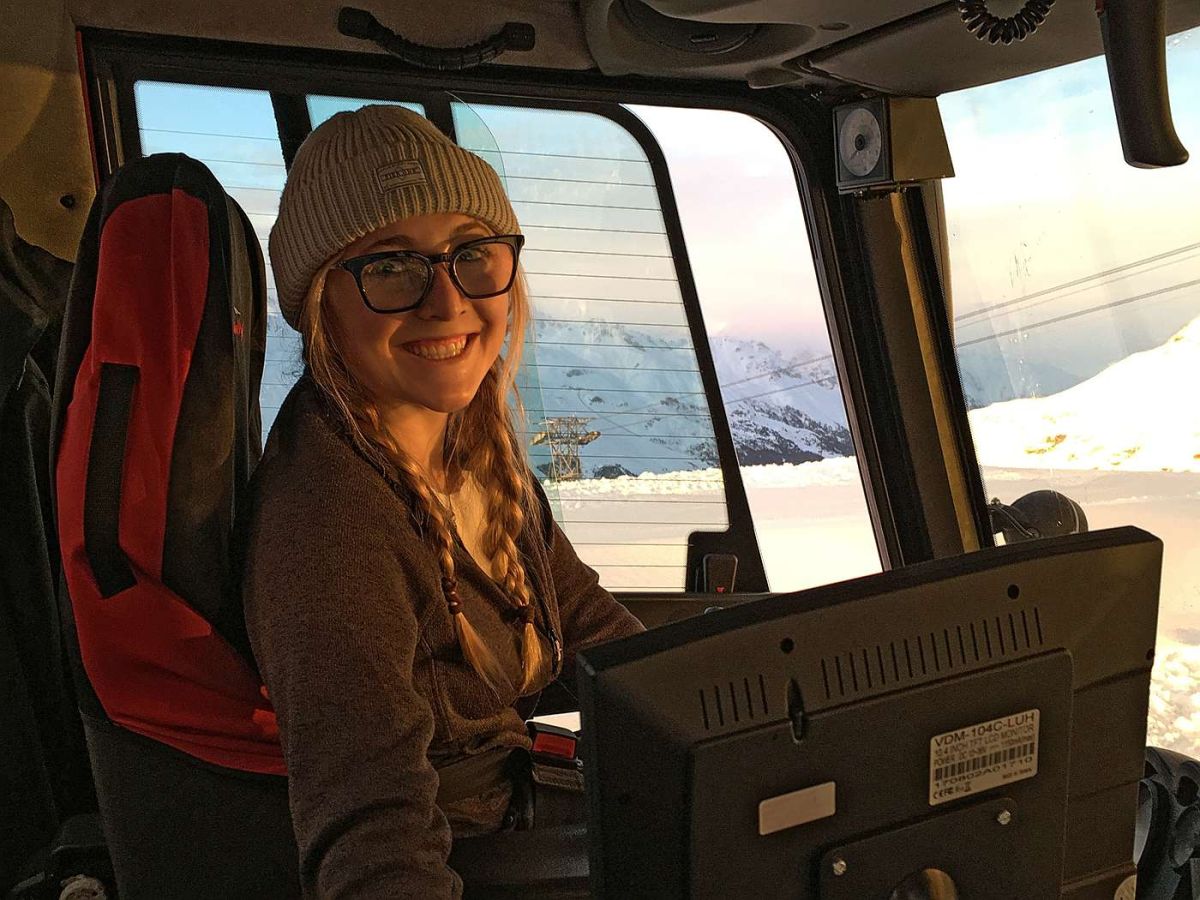 Carla Hübscher beginnt ihre Schicht im Pistenbully bei Sonnenuntergang. Foto: Corvatsch AG