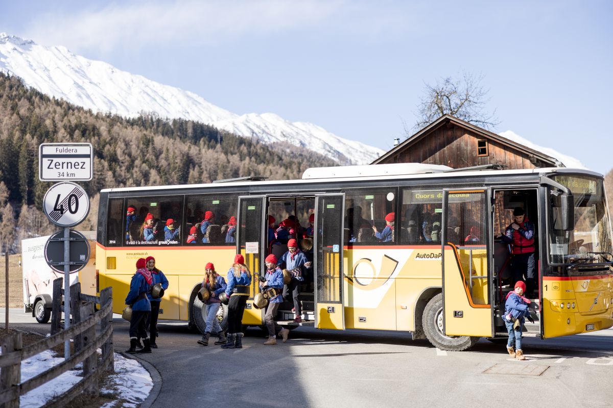 Ils uffants van da cumün a cumün, tanteraint eir cul bus. fotografia: Dominik Täuber