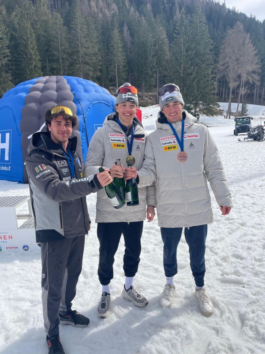 Zeit zum Anstossen: Das Podest der Alpencup-Gesamtwertung der Herren, Isai Näff in der Mitte, rechts Niclas Steiger. Foto: Marco Isenschmid/Swiss-Ski