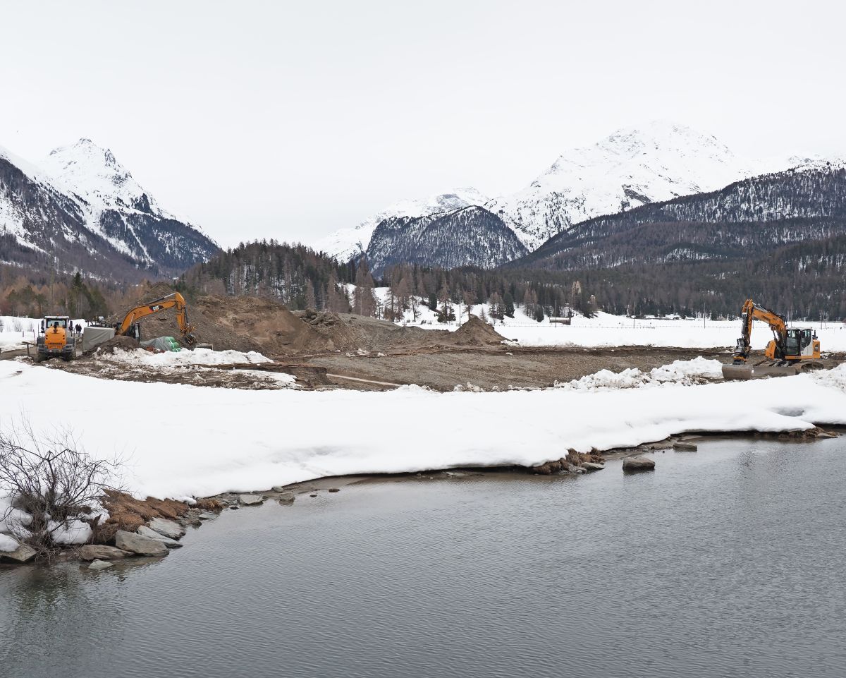 Die Arbeiten für die Inn- Revitalisierung in Celerina sind bereits wieder gestartet. Bei der Ochsenbrücke ist eine grosse Grube ausgehoben worden. Dort entsteht ein Biotop.
