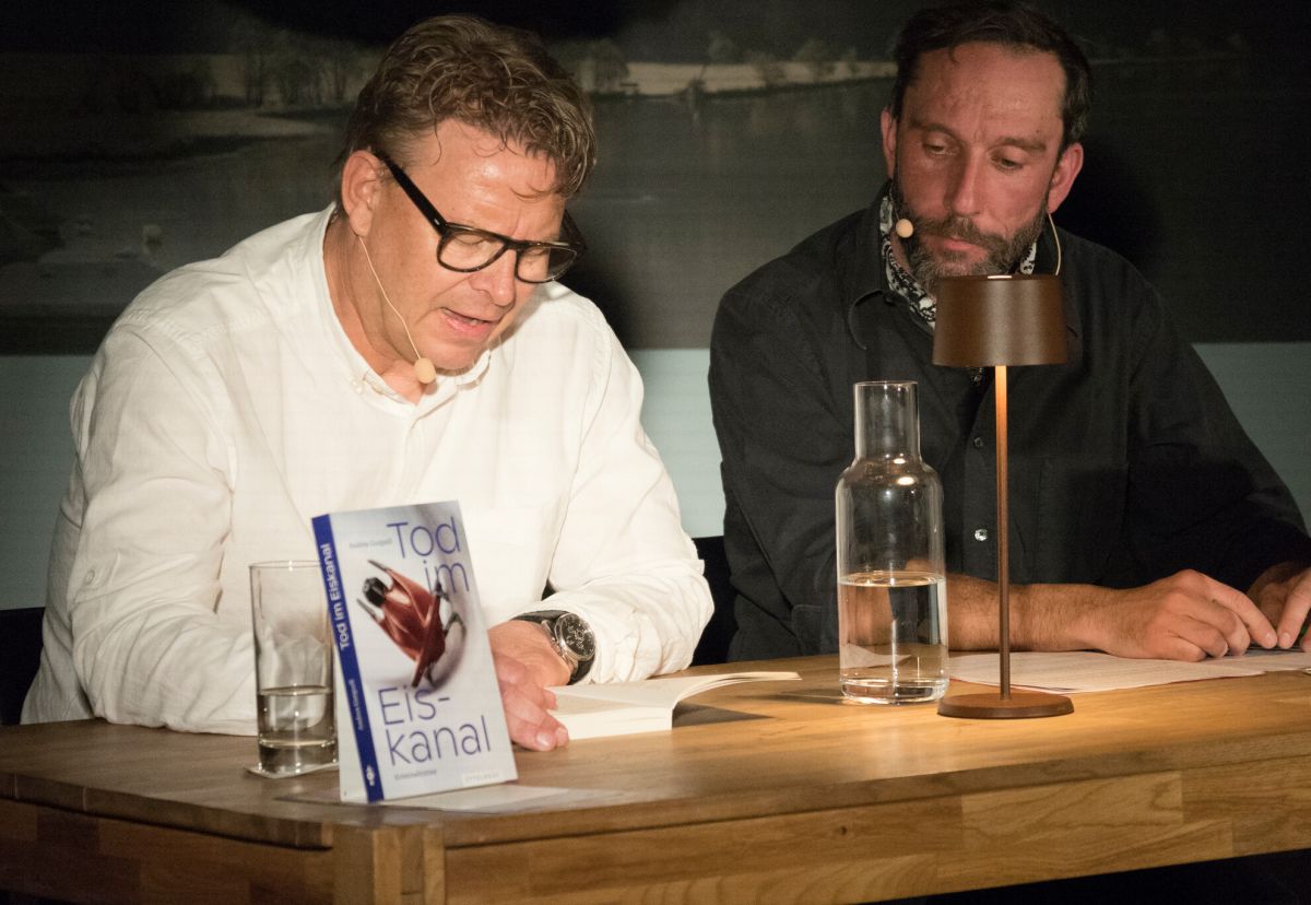 Andrea Gutgsell liest anlässlich der Silser Büchertage aus seinem neuen Roman. Rechts ist Moderator Lorenzo Pollin zu sehen. Foto: Reto Stifel