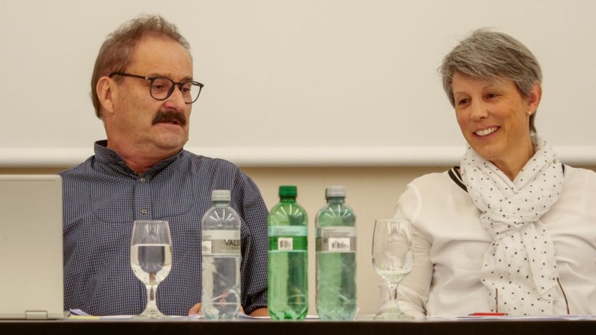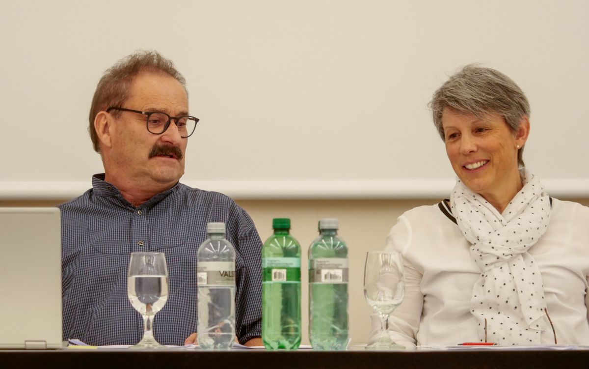 Victor Peer (a schnestra), il president da la CEE, ha ingrazchà a l’anteriur administradur ed actuar Fritz Felix per sia lavur. Sia successiun ha surtut Gianna Rauch Poo. fotografias: Jon Duschletta