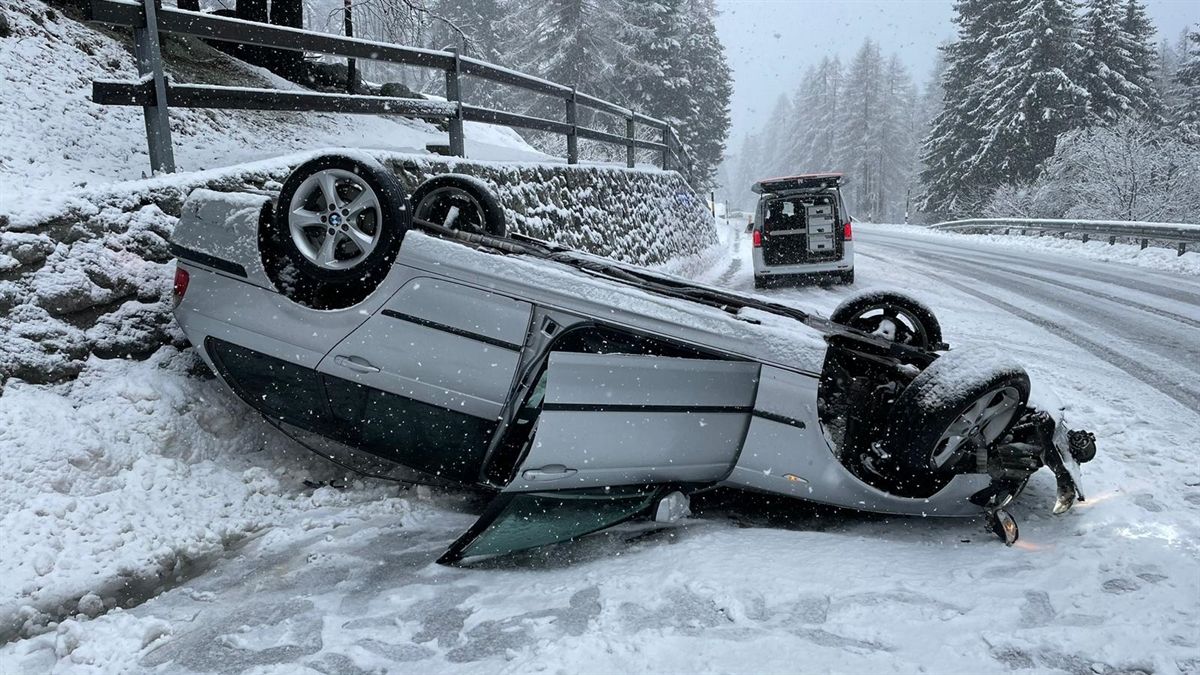 Ein 36-jähriger Personenwagenlenker fuhr um 13.30 Uhr von Casaccia talwärts in Richtung Vicosoprano. In einer Rechtskurve ausgangs Löbbia rutschte das Fahrzeug, ausgerüstet mit Sommerpneu, auf der schneebedeckten Fahrbahn gegen links, überquerte die Gegenfahrbahn und kollidierte frontal mit der Stützmauer. Der Personenwagen wurde durch die Kollision auf das Dach gekippt. Der Lenker blieb unverletzt und konnte das Fahrzeug selbstständig verlassen. Am Fahrzeug entstand Totalschaden.