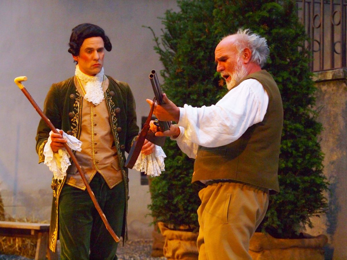 Joos Risch, oriund da Sta. Maria (a dretta), in acziun pel toc «Der Rehbock» dürant il «Frech», il gö al liber dal 2014, a Cuoira (fotografia: Evelyn Riedi).
