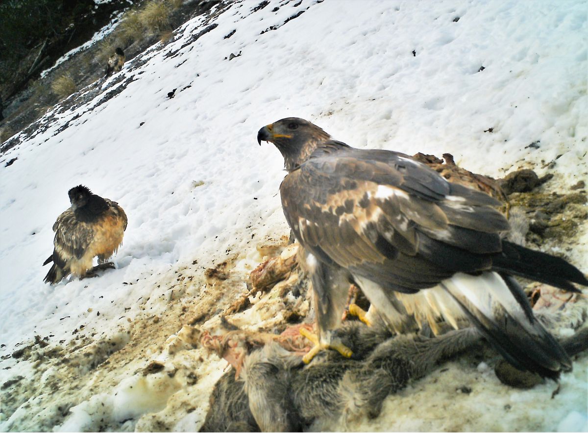 Ein zweijähriger Steinadler auf einem Hirschkadaver. Daneben wartet ein ebenfalls jugendlicher Bartgeier bis er an der Reihe ist. Ein zweiter Bartgeier wartet noch ausserhalb des Bildausschnitts. Foto: David Jenny