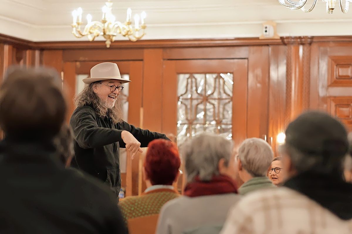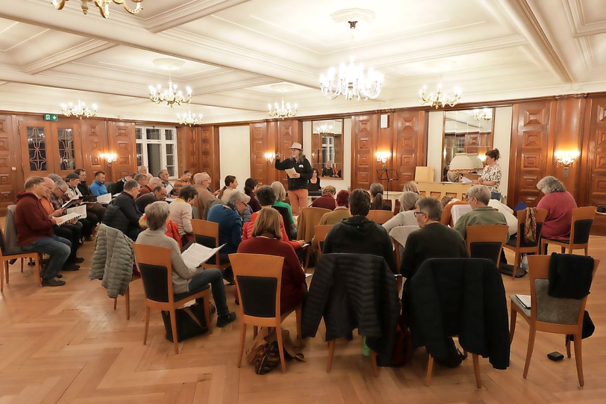 Urs Leonhardt geniesst die Chorprobe mit einheimischen Sängerinnen und Sängern im Hotel Scuol Nairs. Seit Wochen proben rund 50 Sängerinnen und Sänger die «Ode an die Freude» für die Auftritte im kommenden Juni (Foto: Michael Steiner).