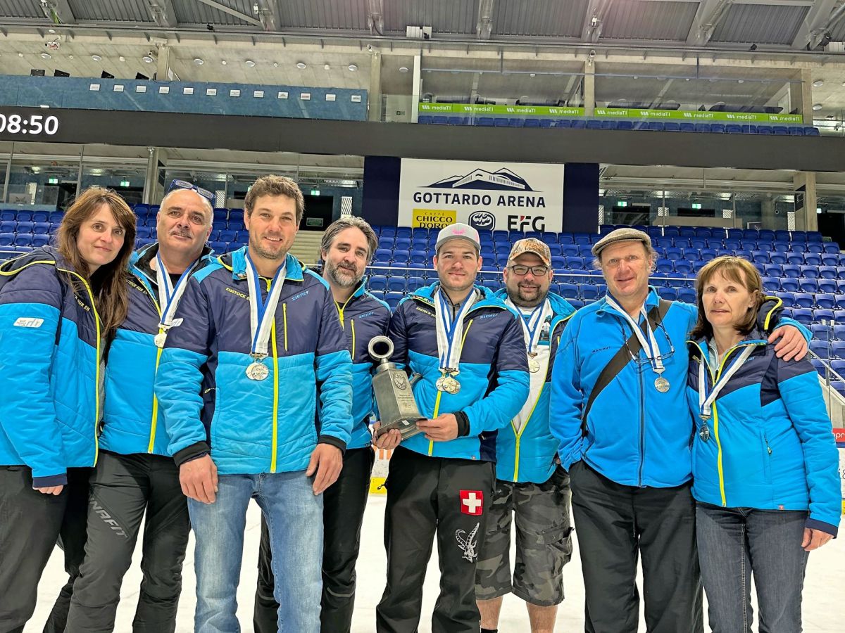 Der ES Sur En gewinnt vier Medaillen an den diesjährigen Eisstock-Bündnermeisterschaften in der Gottardo Arena in Ambri Piotta. Orlando Bass (Mitte mit Pokal) gewann einen kompletten Medaillensatz. Foto: Nicolo Bass