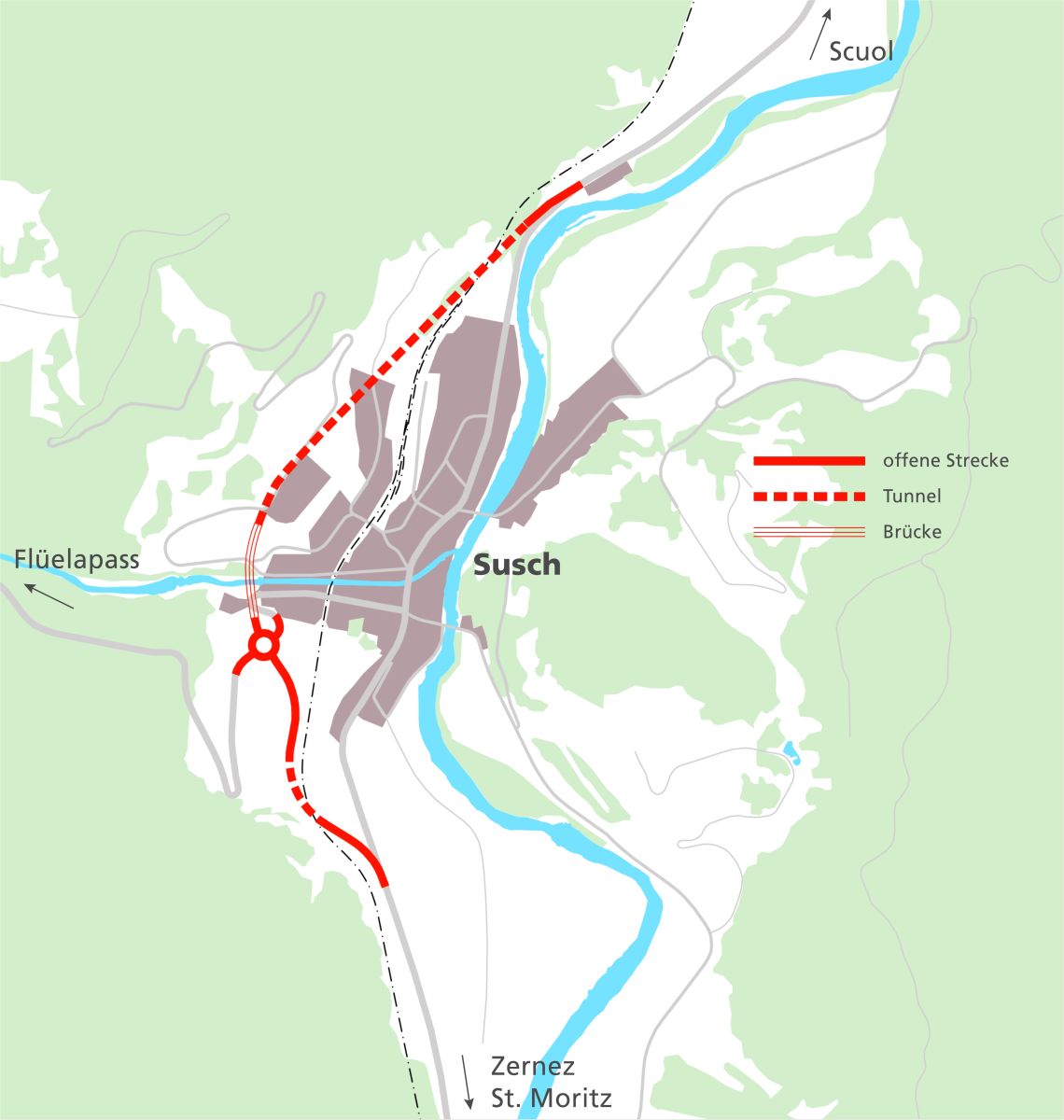 Die Engadinerstrasse verläuft heute mitten durch den historischen Dorfkern von Susch. Die Fraktion Susch der Gemeinde Zernez ist an Spitzentagen im Winter und im Sommer einer vergleichsweise starken Verkehrsbelastung ausgesetzt. Eine Umfahrung soll das Dorf vom hohen Verkehrsaufkommen entlasten. Bereits in den Neunzigerjahren standen eine Ost- und eine Westvariante zur Diskussion, wobei sich die damalige Gemeinde Susch und der Kanton nicht auf eine gemeinsame Variante einigen konnten.