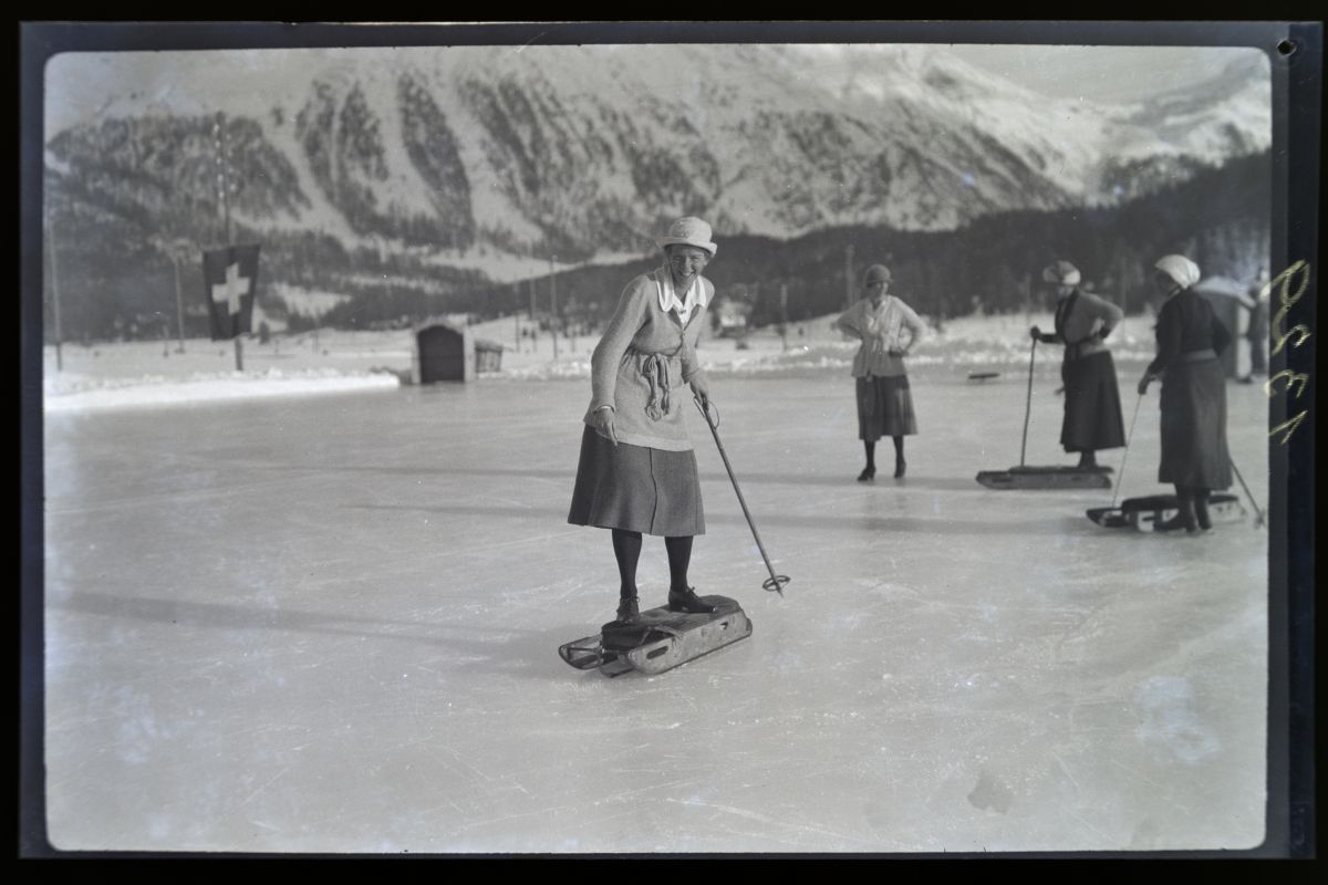 Schlitten stossen als Freizeitbeshcäftigung für die Engadiner Gäste. Foto: Gustav Sommer/Kulturarchiv Oberengadin