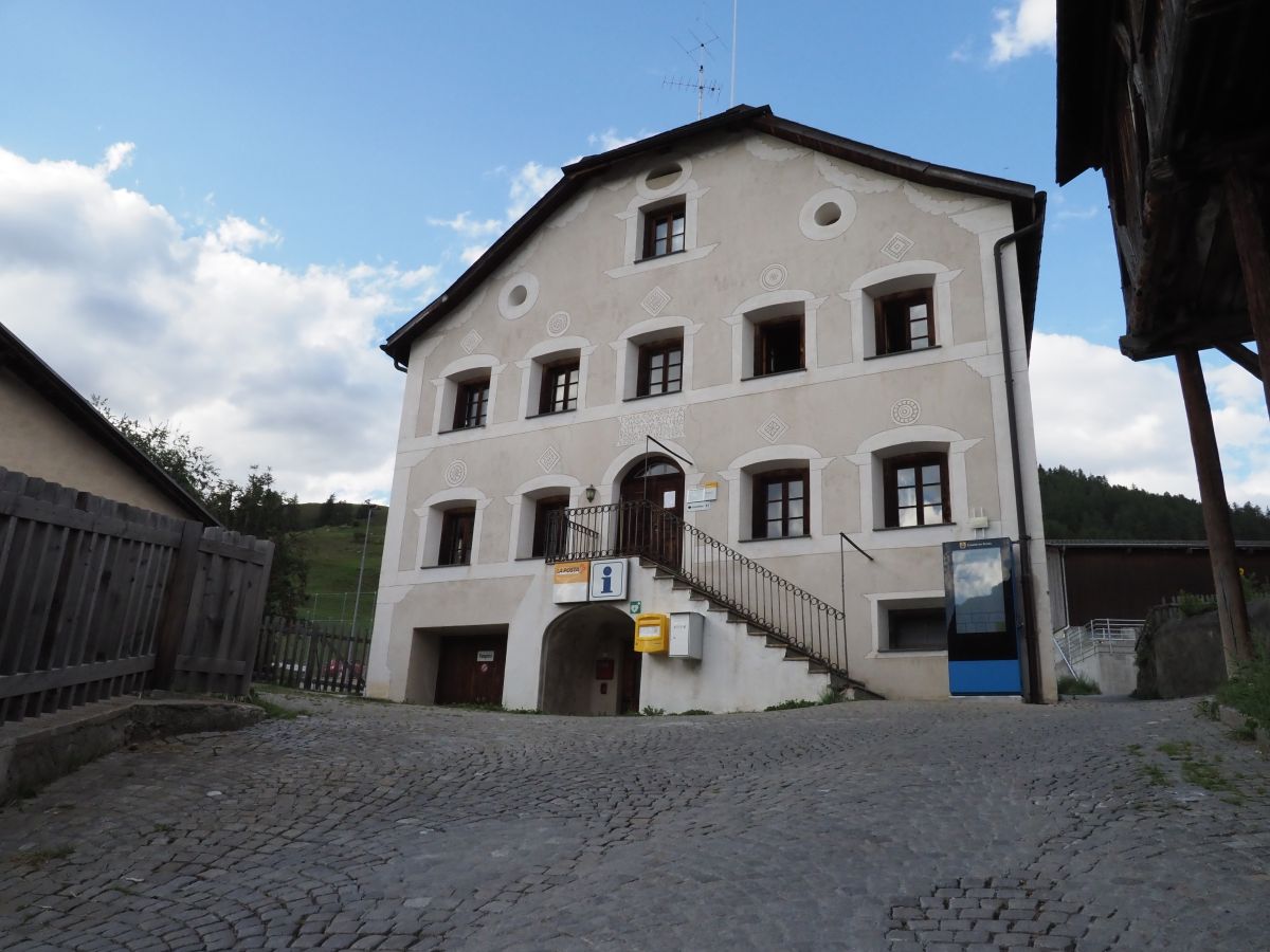 La chasa da scoula da Guarda: sül prüm plan – entrond sü da s-chala – as rechatta il büro turistic cun servezzans da posta. I’l plan d’immez s’installarà ün büro d’architectura (fotografia: David Truttmann).
