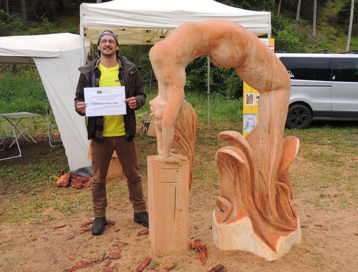 L’artist victur Gerald Lutz cun sia sculptura «Weltenbrücke/Nixe» (fotografia: Benedict Stecher).