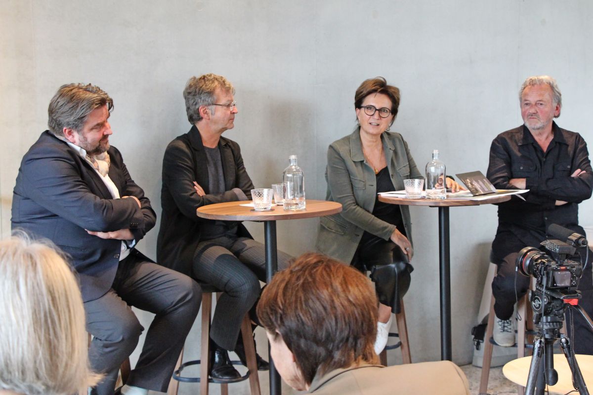 Die Gesprächsteilnehmer von links: Christian Kathriner, Stephan Kunz, Bettina Plattner-Gerber und Gion A. Caminada im Gespräch über das Wechselspiel zwischen Kunst und Rezipient. Foto: Stefanie Wick Widmer