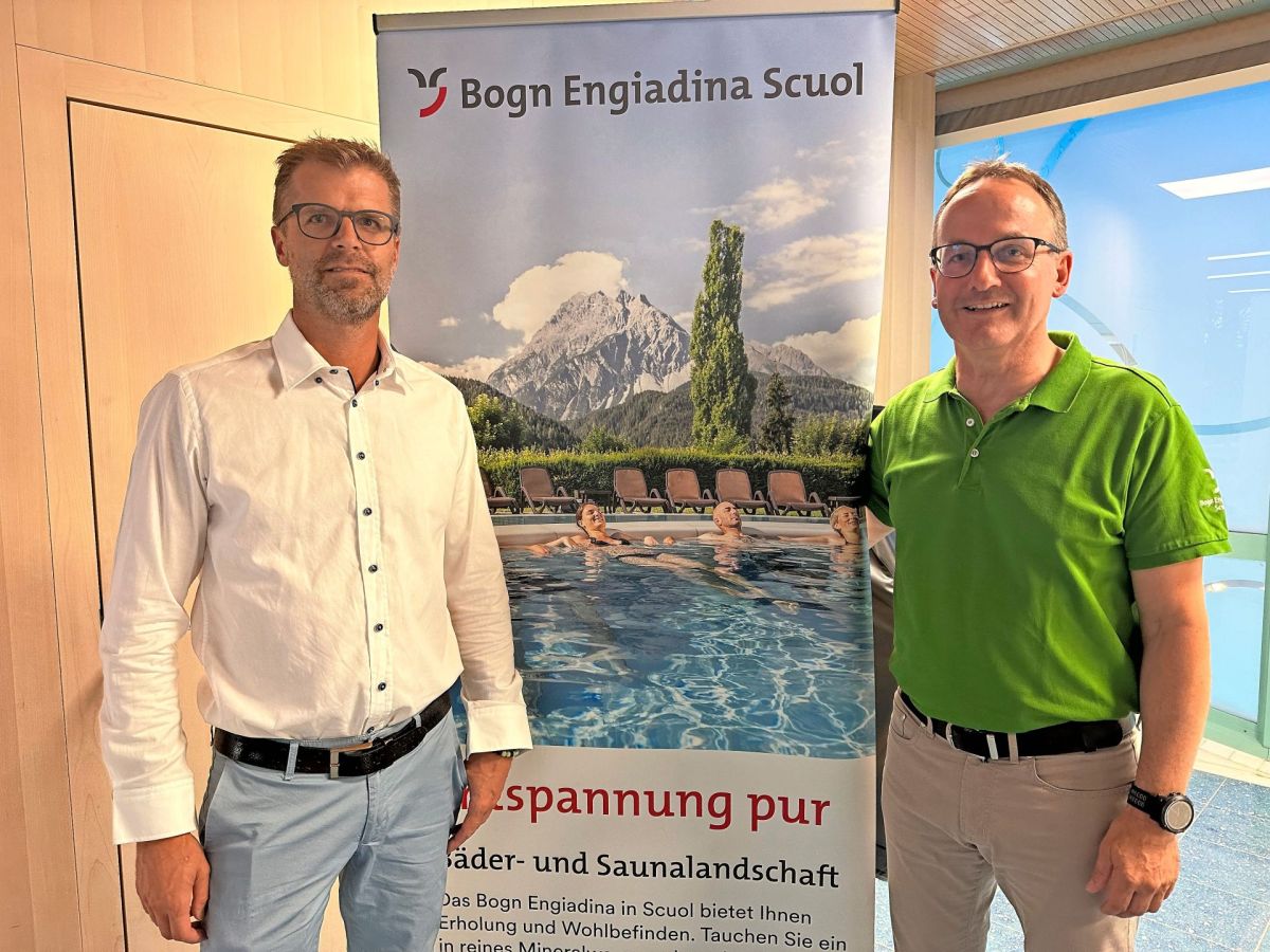 Adrian Barbüda, president dal cussagl administrativ, e Claudio Duschletta, directer dal Bogn Engiadina Scoul, sun cuntaints cul resultat da gestiun (fotografia: Nicolo Bass).