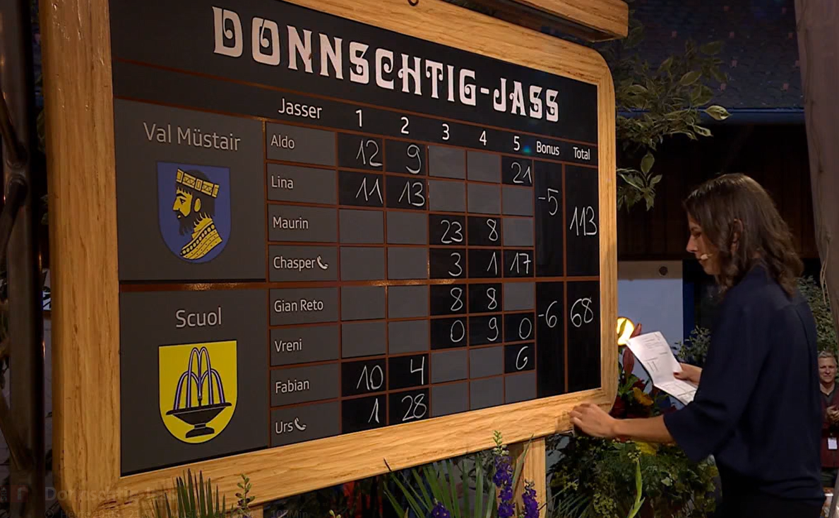 Die Jasserinnen und Jasser aus Scuol haben die Spieler aus Val Müstair am "Donnschtig-Jass" geschlagen. Screenshot: SRF