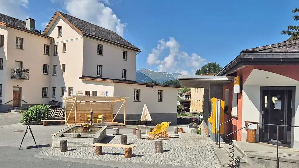 Sülla plazza cumünala a Ftan sun installadas plüssas mobiglias per tour plazza, discuorrer ed activar la cumünanza (fotografia: RTR).