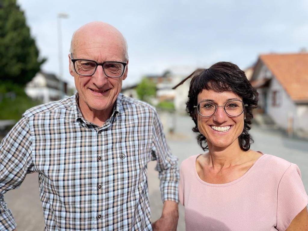 La presidenta da la società da teater Ftan Aita Bazzell e l’autur dal toc Mario Pult s’allegran per la biennala da teater a Locarno (fotografia: RTR).