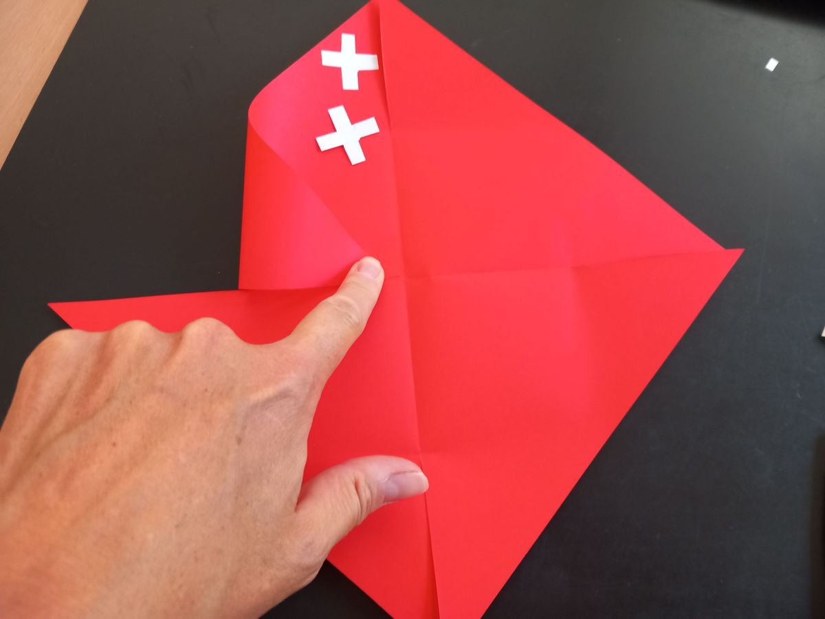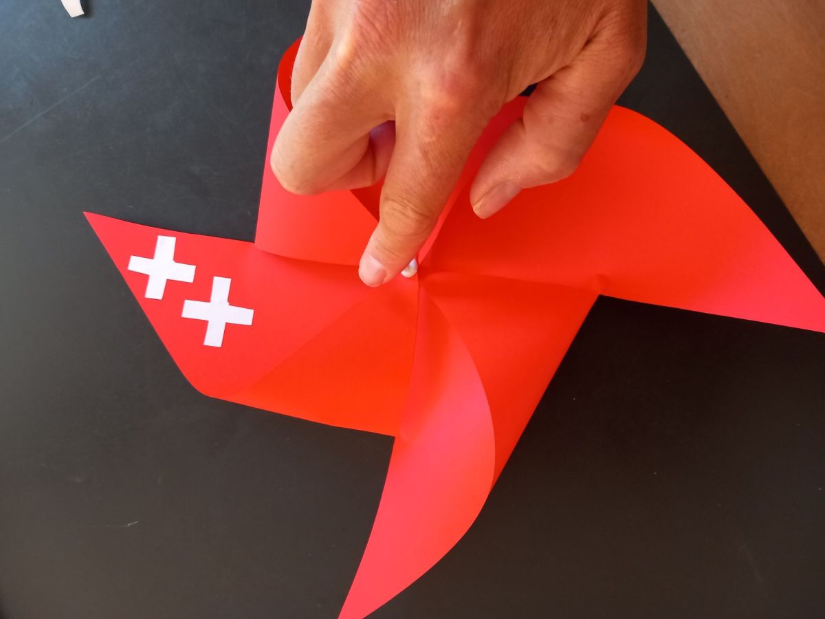 Falte nun jeweils eine Ecke zur Mitte hin, um zu sehen, wo das Windrad dekoriert werden kann. Schneide nun kleine Schweizerkreuze aus weissem Papier aus und klebe sie auf.