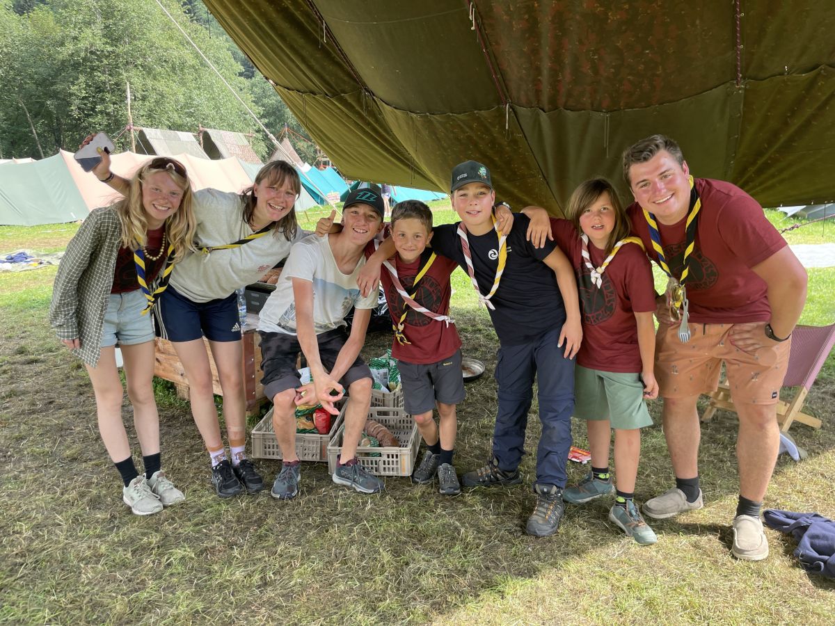 Inzwischen ist Mittagszeit, alle Eltern haben sich bei den jeweiligen Abteilungen ihrer Kinder eingefunden, um gemeinsam unter dem grossen Zelt, dem Sarasani, zu essen. Auch auf dem Familienlagerplatz etwas abseits des Hauptlagerplatzes wird gekocht und gegessen. Es ist das erste Mal, das am Kantonslager explizit auch Familien von ehemaligen Pfadfinderinnen und Pfadfindern eingeladen wurden.