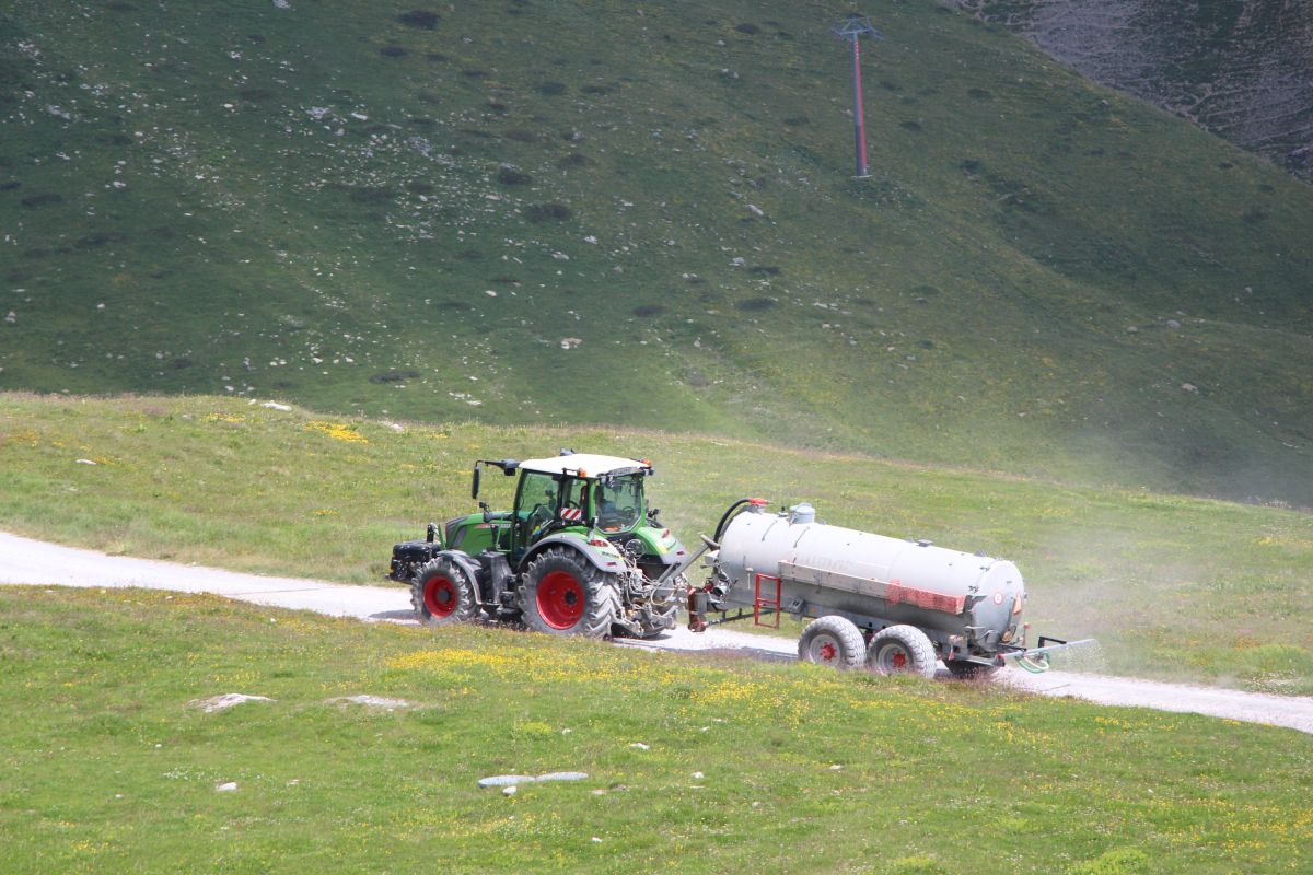 Ein Traktor mit einem Güllefass kurvt unentwegt auf den Wander- und Bikewegen von Corviglia herum. Er bewässert die Zufahrtswege zur Grossbaustelle des Lej Nair Pitschen, damit sich nicht zu viel Staub entwickelt.