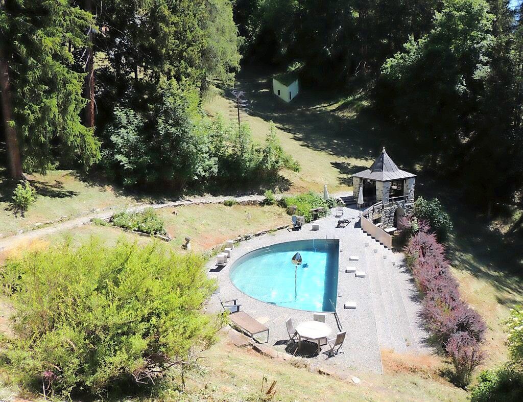Il bogn avert cun ricover, survart la sculptura pro’l bogn avert e la punt dals asens (fotografia: Benedict Stecher).