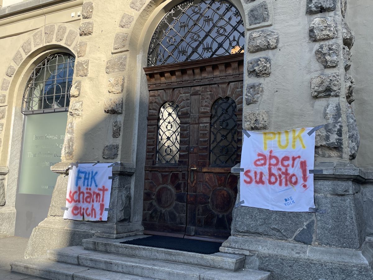 Kritik an den Verantwortlichen der Infra gab es zum einen visuell beim Eingang zum alten St. Moritzer Schulhaus, wo zwei Transparente mit der Aufschrift «FHK, schämt euch» und «PUK, aber subito!» mit dem Absender «Das Volk» angebracht waren. ...