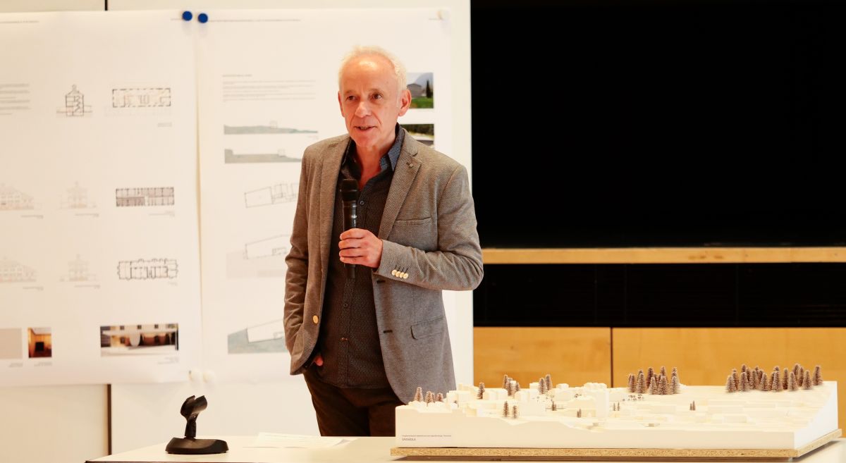 Das Siegerprojekt Spaniola des Churer Architekturbüros Giubbini Architekten mit dem geplanten Neubau der Jugendherberge in Turmform (rechts). Visualisierung: Giubbini Architekten ETH SIA