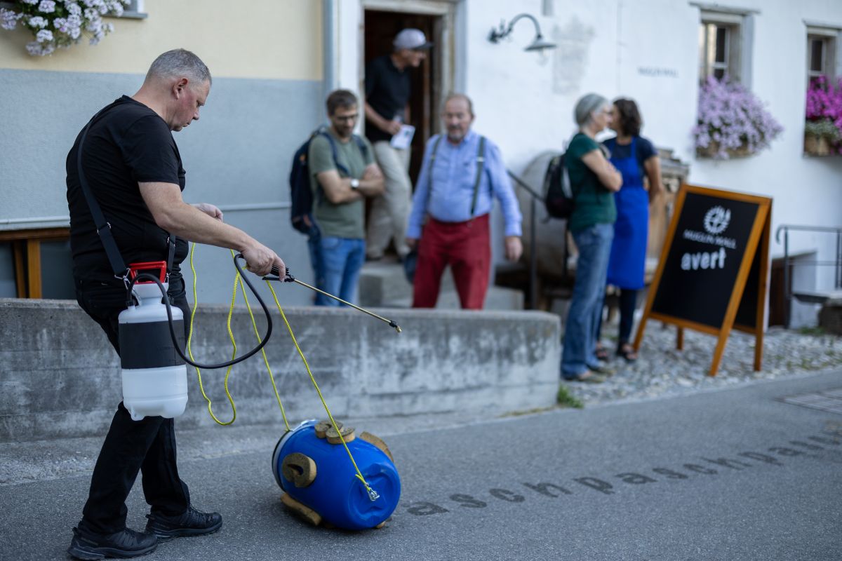 L’artist Pascal Lampert da Sta. Maria (a schnestra) ha performà davant il Muglin Mall sia inscripziun da «pasch» sülla via da Paclera (fotografia: Dominik Täuber).