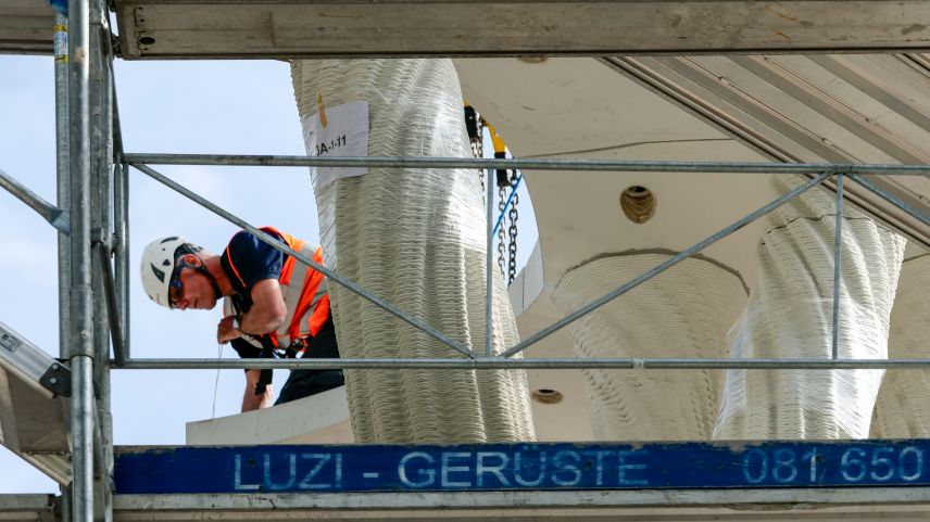 Was am 10. Juli mit der Montage der ersten Säule begann, nimmt mehr und mehr Form an: der Weisse Turm zu Mulegns. Kürzlich wurden die Säulen des dritten Stockwerks montiert. Ein Augenschein vor Ort beim aktuell wohl modernsten Bauwerk der Schweiz, wo die Bauteile aus dem 3D-Drucker stammen.