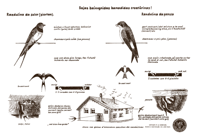 I’ls ans intuorn il 1950 vaivan il biolog Steivan Brunies e l’illustratur Jean A. Degen creo 61 tevlas davart plauntas e bes-chas ladinas. L’an passo ho l’editura Mevina Puorger reedieu quist cudesch. La terminologia exacta ed ils disegns detaglios sun surpiglios ün ad ün.