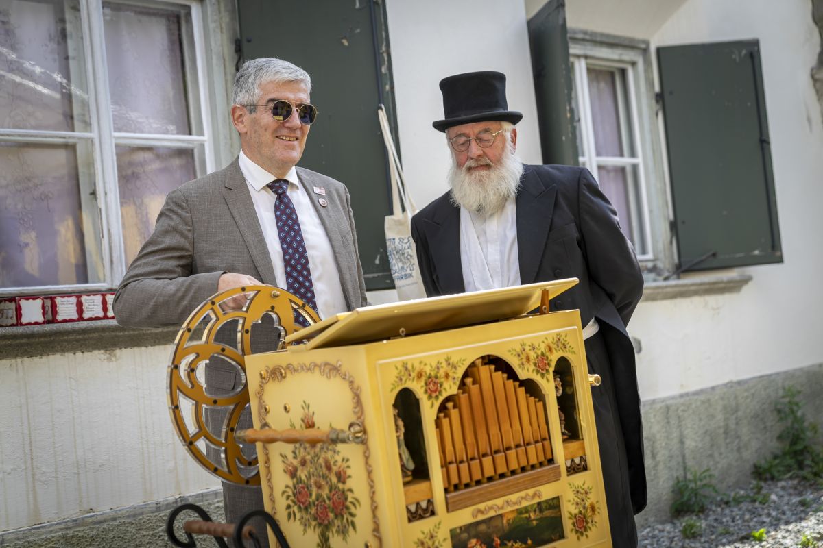Regierungsrat Jon Domenic Parolini versucht sich als Drehorgelmann. Fotos: Yanik Bürkli