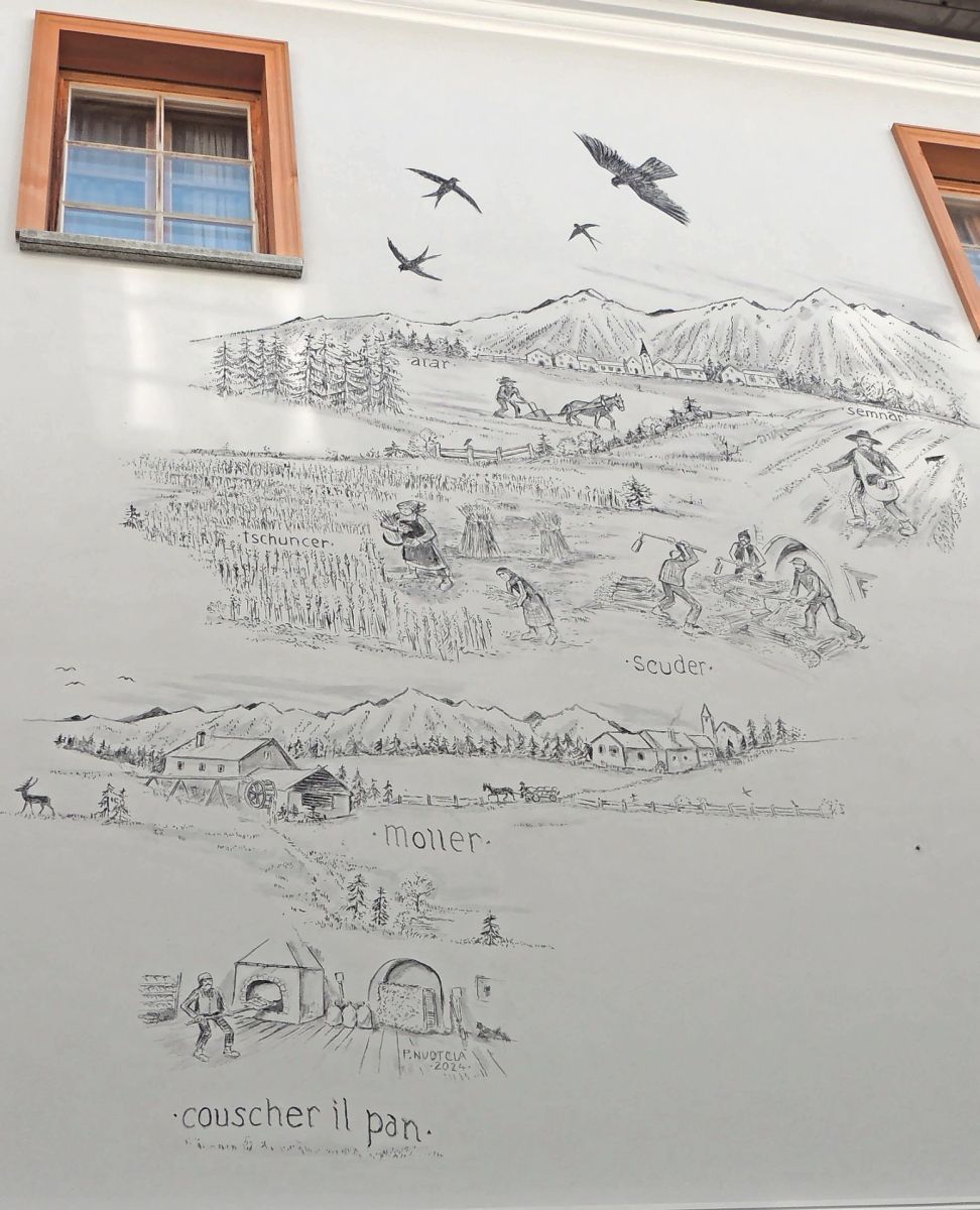 D’incuort ha realisà Paulin Nuotclà duos pitturas grondas vi da la fatschada dal Cafè-Furnaria-Pastizaria Giacometti immez Lavin. Ün disegn muossa bes-chas chi vivan illa regiun. E tschella pittura quinta l’istorgia dal gran al pan – cun ...