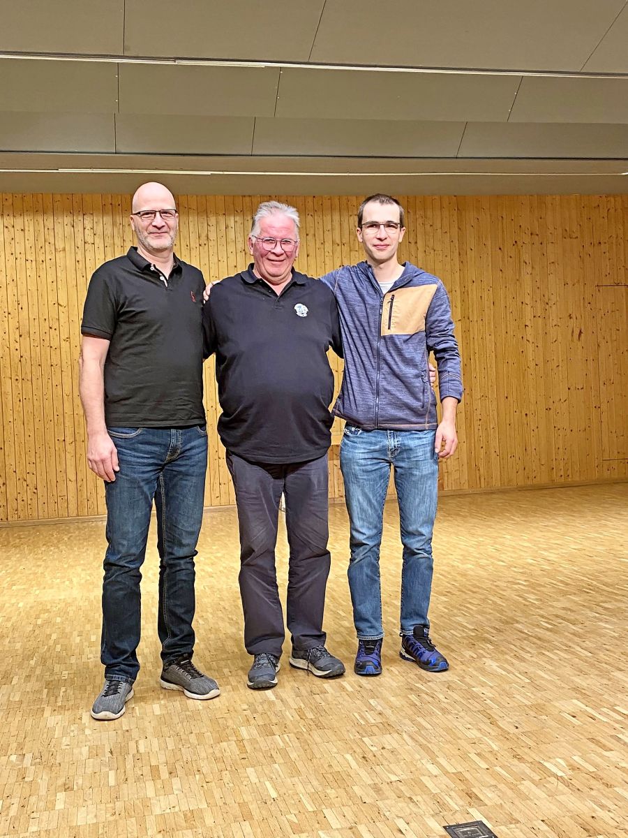 Von links: der neue Dirigent Martin Stecher, Präsident Heinz Ming und der abtretende Dirigent Curdin Caviezel. Foto: Not Janett-Jenal
