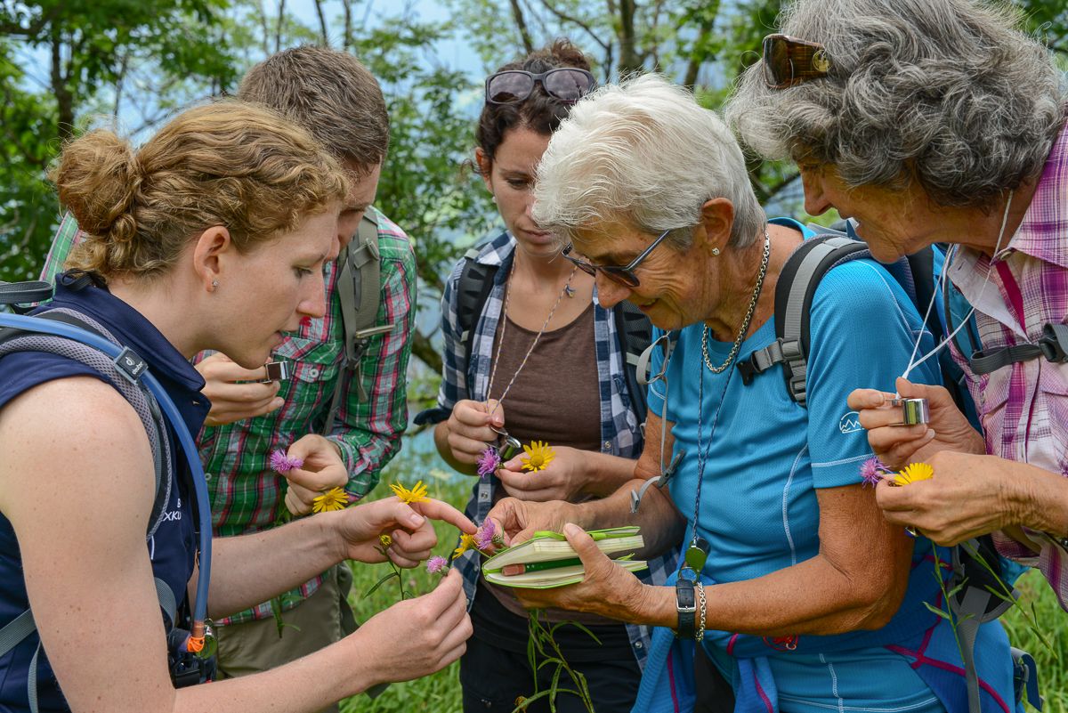 La biologa Constanze Conradin culs partecipants e las partecipantas d’üna da sias excursiuns botanicas in Engiadina Bassa (fotografia: Botanik Exkursionen).